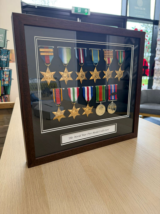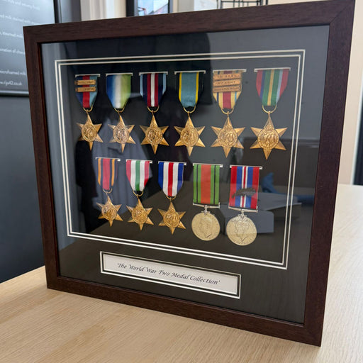 The entire WWII Medal collection - 11 medals, clasps and MiD Oak Leaf, framed in a dark wood frame with black mount card and an inscription reading...