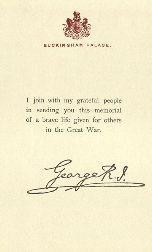 A reproduction of the letter that accompanied in the Memorial Scroll issued to the next of kin of those killed during the First World War.