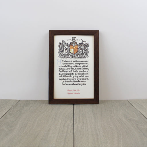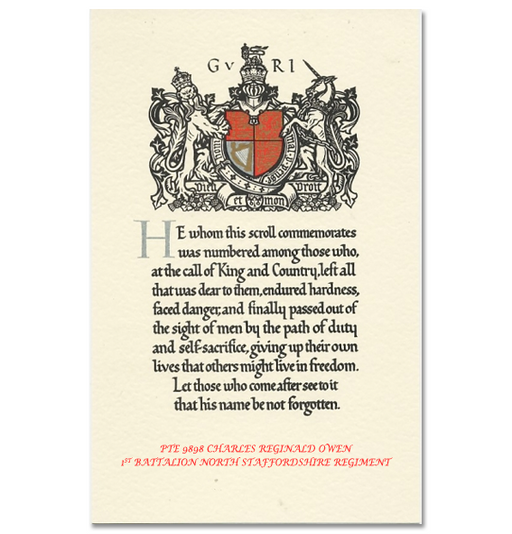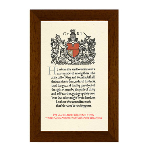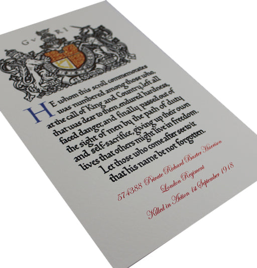 A reproduction of the scroll issued to the next of kin of those killed during the First World War. We will print the individual details at the bott...