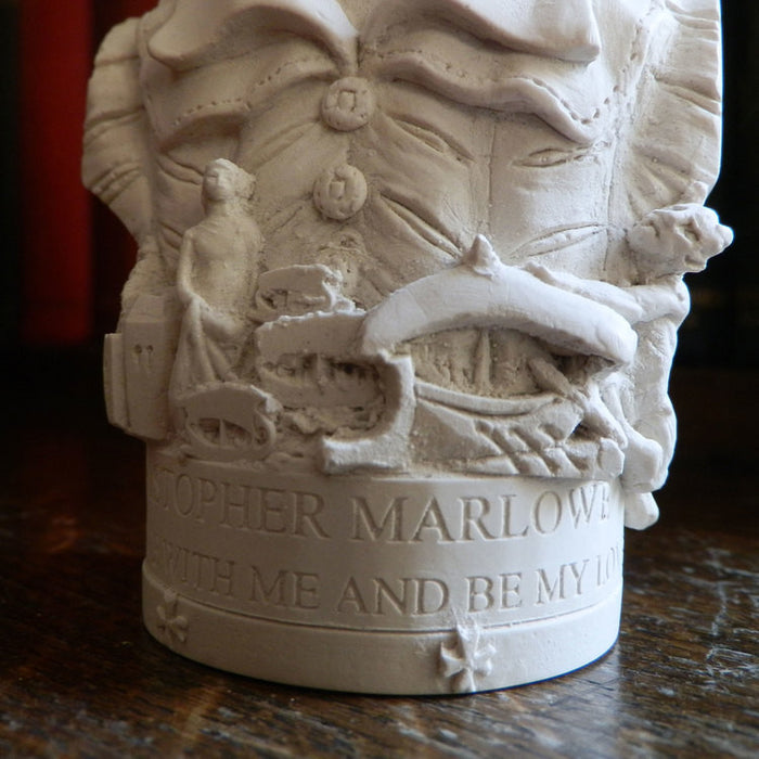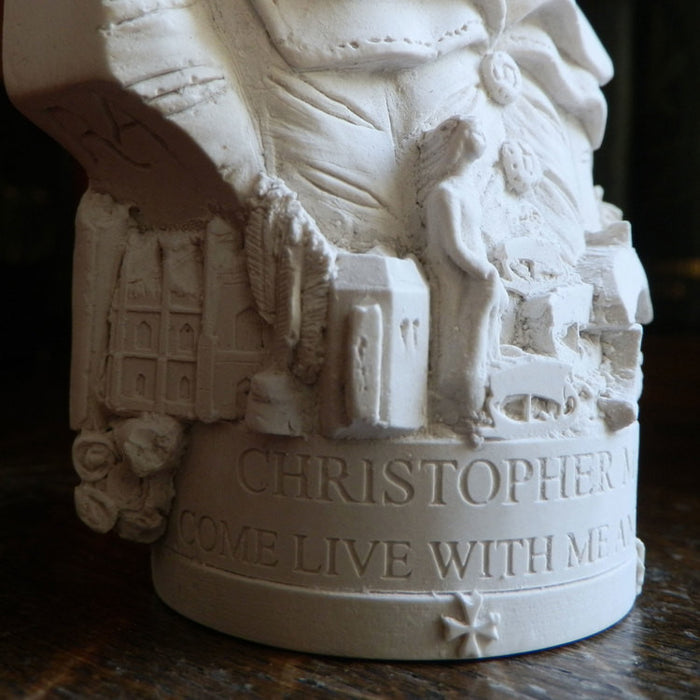 As with all Famous Faces there are objects around the base. For this bust we have included The Rose Theatre, Helen of Troy, the devil from Doctor Faustus, the Maltese cross from the Jew of Malta and quill and ink.