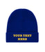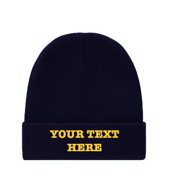 Our classic Beanie Hat with test of your choice embroidered in gold. Please add the details you require in the comments box below.