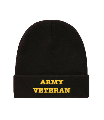Our classic Beanie Hat with ARMY VETERAN embroidered in gold.