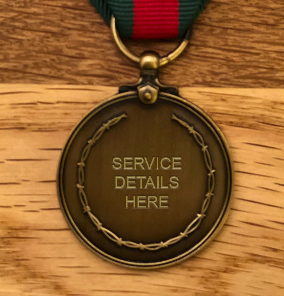 Border Service Commemorative Miniature Medal, available to British and Commonwealth forces on frontier duty throughout the world; Africa, Belize, Borneo, Cyprus, Eritriea Sudan, Germany, Gilbralter, Hong Kong, Malaysia, Northern Ireland etc to wear with pride.
