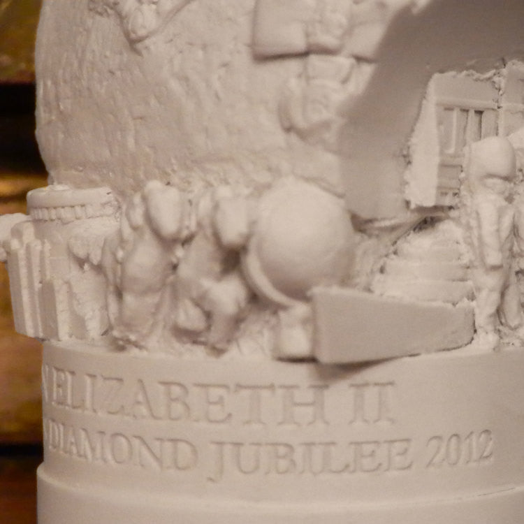 As with all Famous Faces there are objects around the base. For this bust we have included Buckingham Palace with the guard, a globe, horse and carriage, Windsor Castle, horses of Royal Ascot and the QE2.