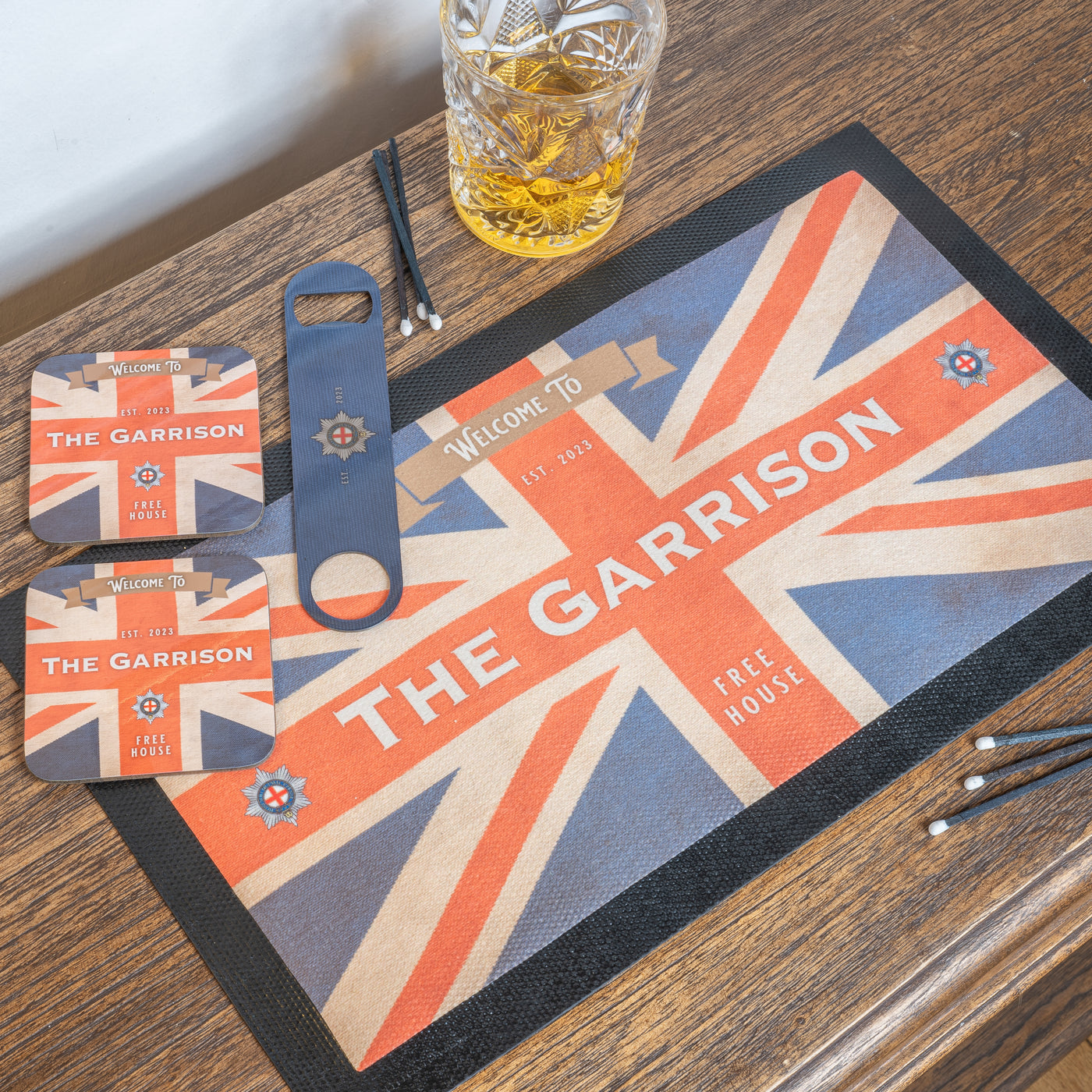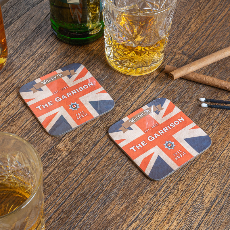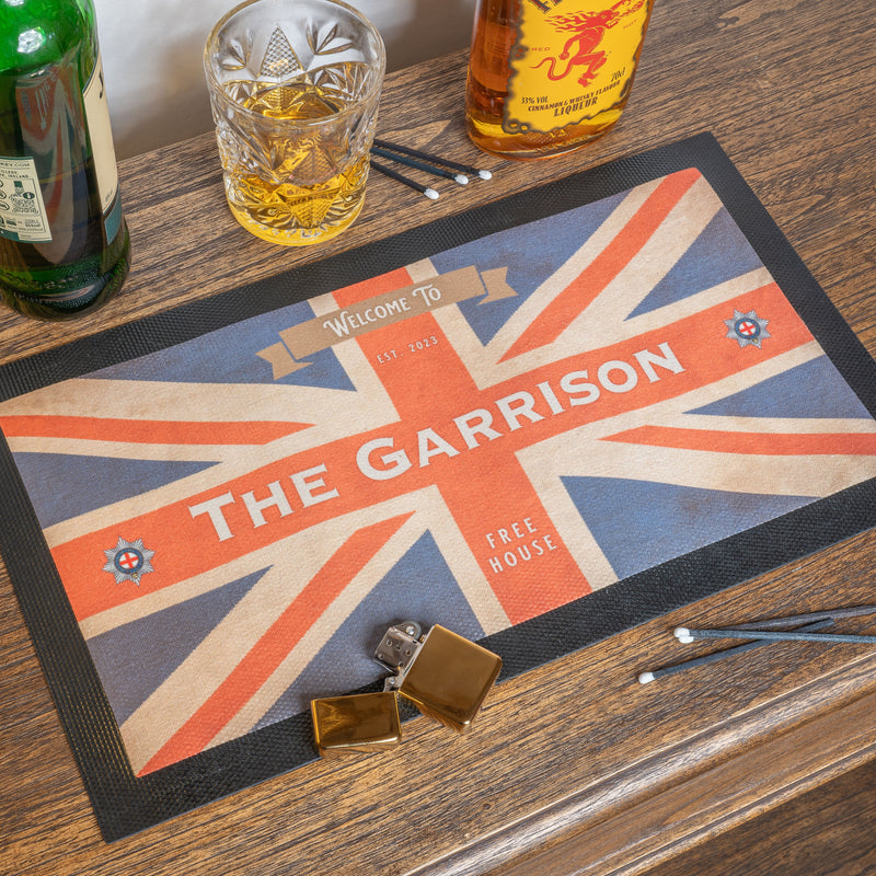 Custom home bar set featuring this exclusive Union Flag design and your Military/Service Crest. Choose from personalised bar runner, 4 coasters, bar blade, aluminium bar sign and classic bar snacks. Our Military Pub Bar Set is sure to go down a treat with any liquor lover or real ale fanatic, and is a great gift idea.