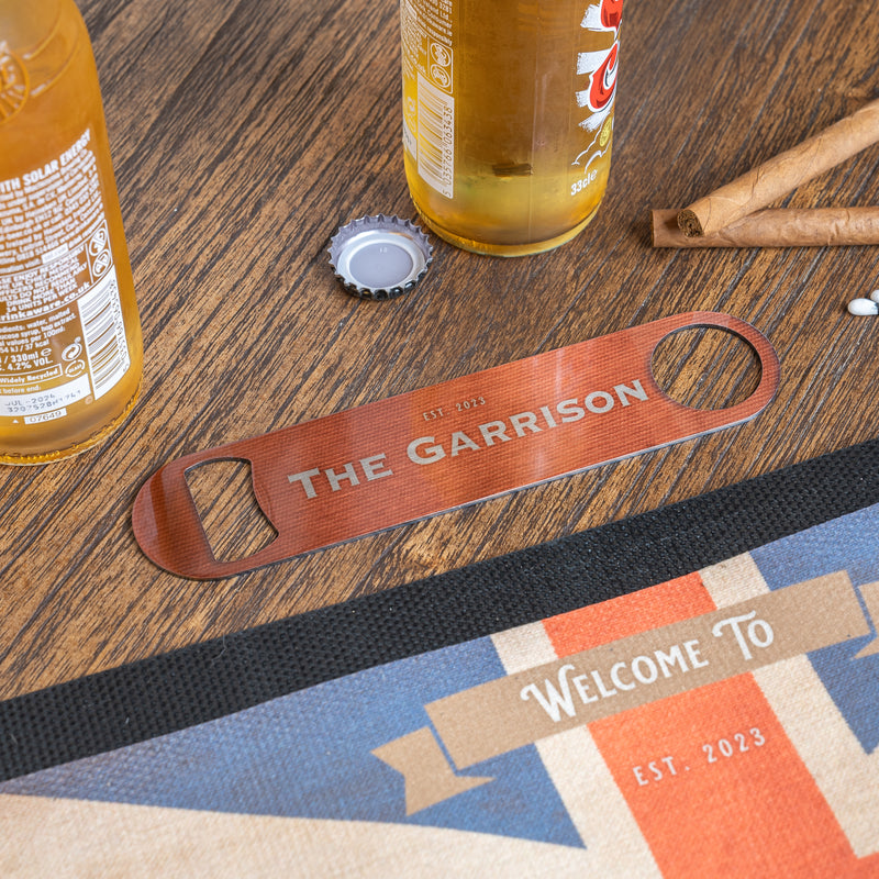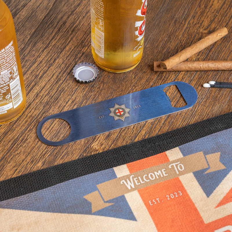 You’re under strict instruction from our bar blade bottle opener to ‘Save water, drink beer’ as written on the front. The back of the bar blade can be personalised with the name of your ‘pub’, for example ‘The Barracks - est. 2021’.