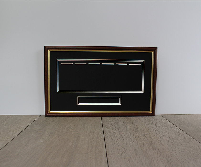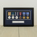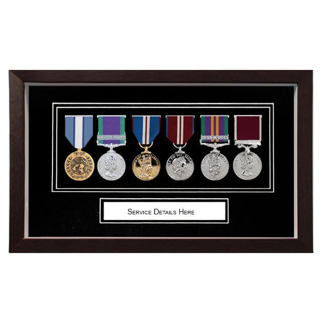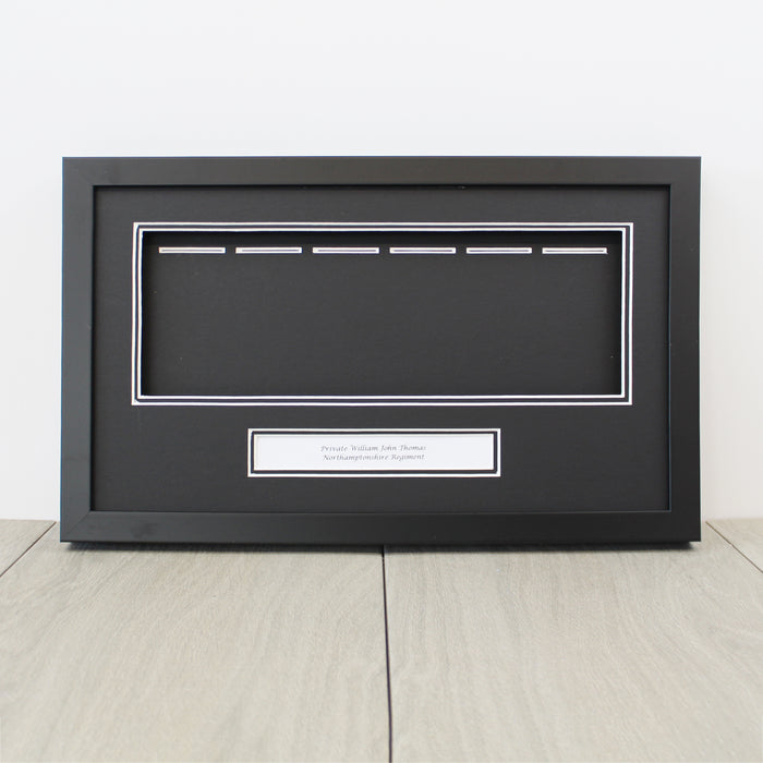 Medal frame for 6 medals and inscription. Our medal frames are available in dark wood, dark wood & gold, black, white, grey and oak. Display your medals with pride in our solid wood, British made frames made to order.