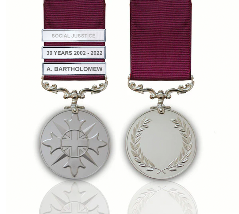 The striking ribbon is woven using traditional methods using the same techniques and in fact the same looms used to manufacture ribbons today's military awards. The silver 'SOCIAL JUSTICE' bar on the ribbon is finished to match that of the medal. Additional engraved bars can be added to the ribbon and the recipients name can be engraved on the reverse of the medal. naming to the back of the Social Justice Medal and we can also add an optional engraved bar to ribbon.
